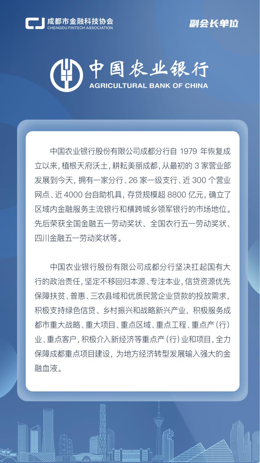 成都市金融科技协会发起单位包括成都交子金控集团、中国农业银行股份有限公司成都分行、中国工商银行股份有限公司成都分行、成都农村商业银行股份有限公司、四川新网银行股份有限公司、成都西南财大交子金融科技创新研究院有限公司、成都交子区块链产业创新中心有限公司、成都智元汇信息技术股份有限公司、成都数联铭品科技有限公司、成都蓉兴创业投资有限公司、成都天府通金融服务股份有限公司、成都金融梦工场投资管理有限公司等12家单位,涵盖了全市金融科技领军企业、金融机构和产学研机构。